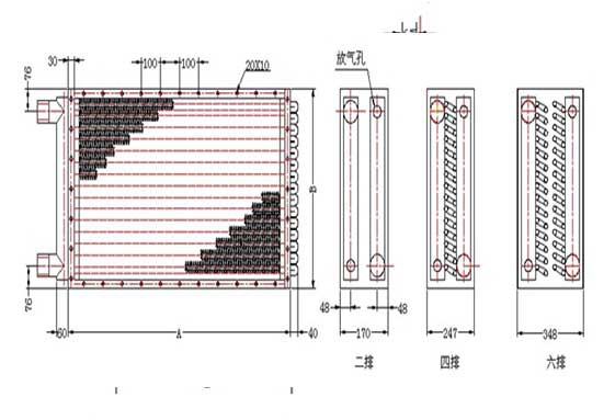 1.GLⅡ工业散热器为钢制双回路(二排)、或多回路(四排、六排)结构,散热管用Ф18*2mm无缝钢管,经专机绕片10*0.3mm皱折钢带而成,呈螺旋状,其片距为3.2mm,承压高,耐腐蚀;2.GLⅡ工业散热器的散热排管全叉排排列,并个单独弯头管连接; 3.GLⅡ工业散热器的散热管特性: